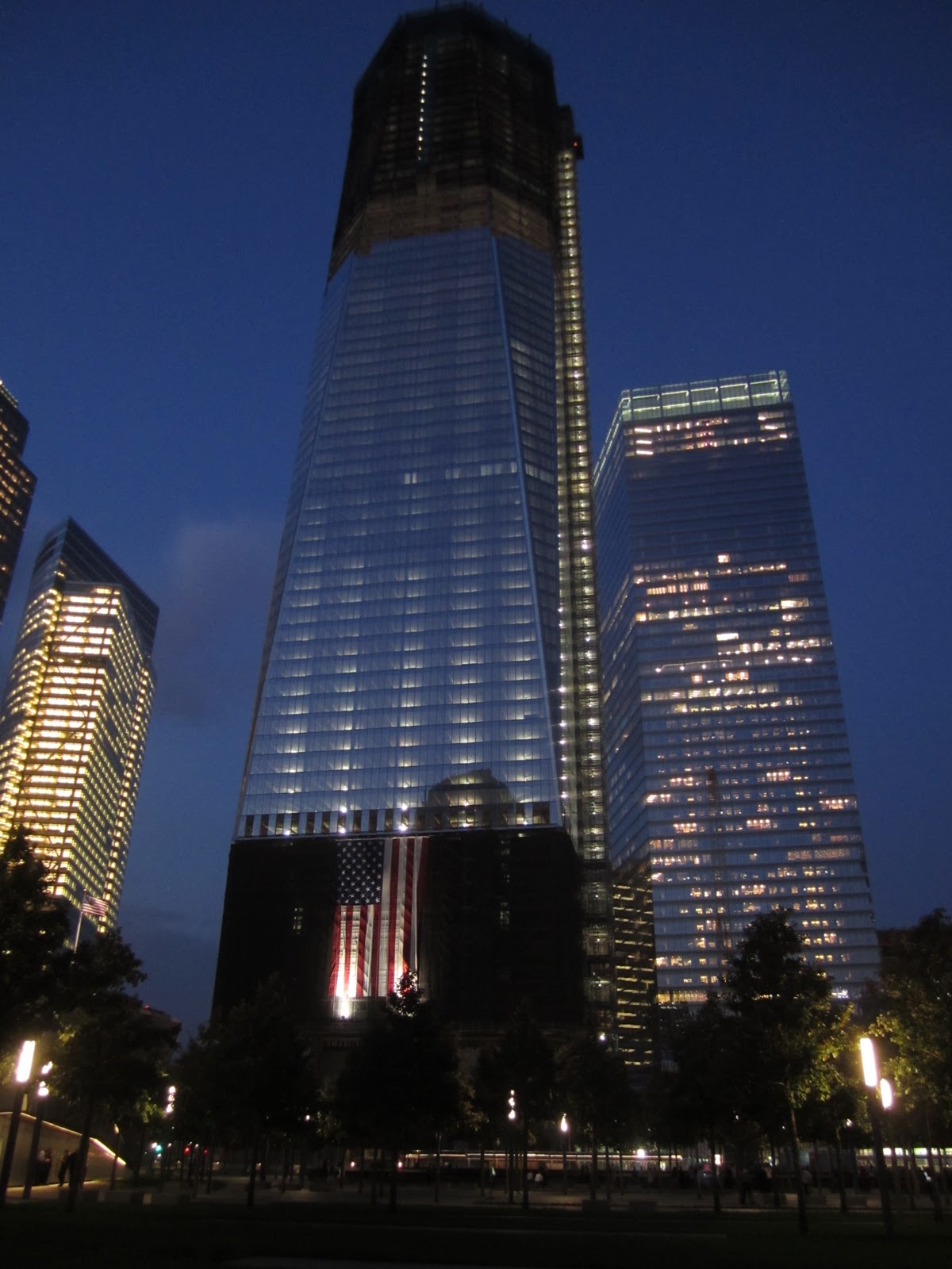 After ten long years, the families touched by the devastation have a place to go and remember their loved ones. And the destruction that took so long to clean up is finally being replaced by new growth and development on the site, as shown by the floor by floor climb of the new One World Trade Center building. I was thoroughly impressed with the way the memorial turned out. It was breathtakingly beautiful. We went at sunset, which I think was the perfect time to see it, as the city was starting to twinkle in the blue-black sky. I can’t wait to go back when the museum opens to the public in 2012.