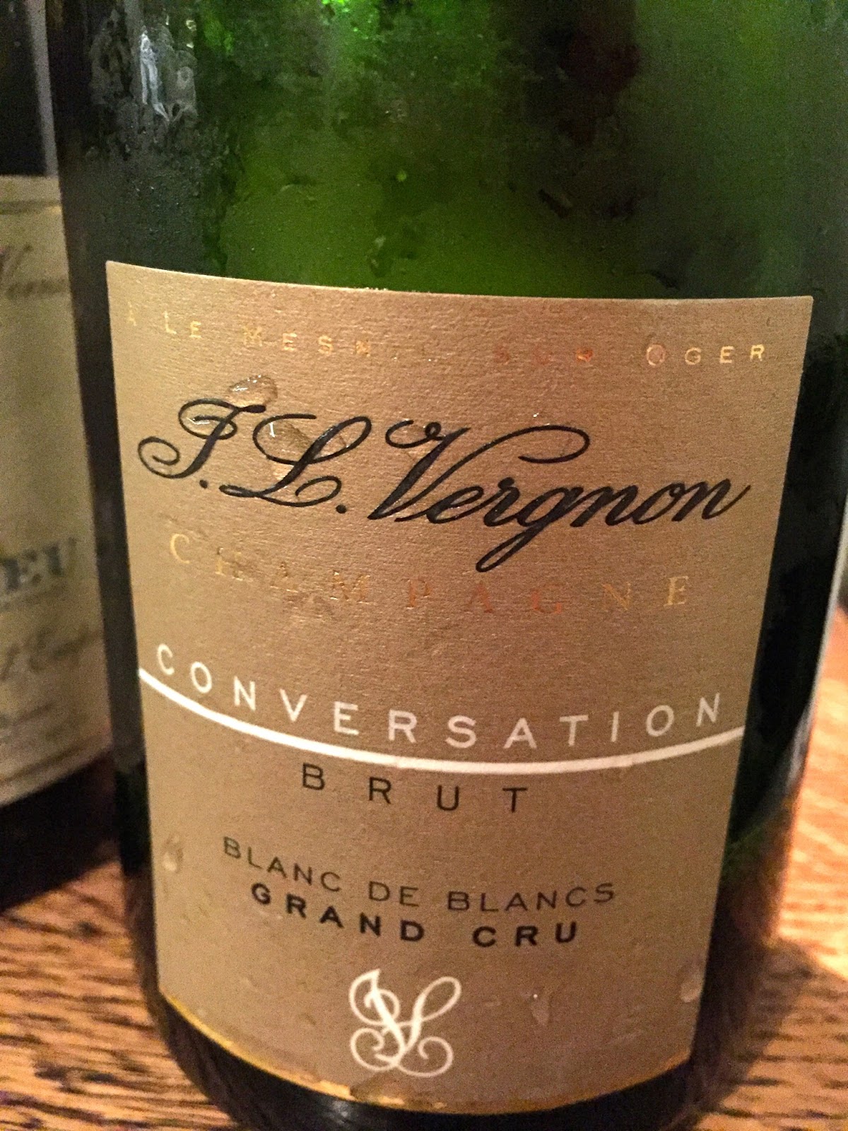 I do remember some stand-out wines that I wanted to share including the first aperitif wine of the night, a champagne from J.L. Vergnon. The “Brut Conversation” blanc de blanc grand cru is made from 100% Chardonnay (hence the term “blanc de blanc). The nose had that bready/yeasty characteristic that I have come to love in Champagne. Notes of “butter and biscuit” evolved on the palette into slightly nutty and honeyed flavors yet remaining dry with tight, small bubbles, making it extremely thirst-quenching! This taste made me excited for the latter half of our trip that would take us through Champagne-proper, more to come on that!